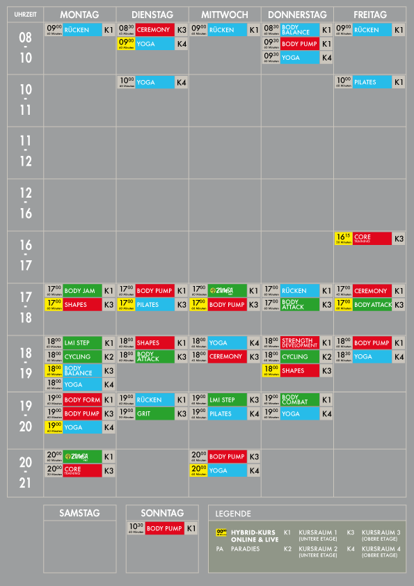 Von schweißtreibendem Spinning bis zu himmlischem Hot Yoga – wähle aus einem Kurskatalog, der so vielfältig ist wie das Buffet bei einer Hochzeit. Langweile? Kennen wir nicht! Jeder Tag bringt eine neue Möglichkeit, etwas Anderes auszuprobieren.